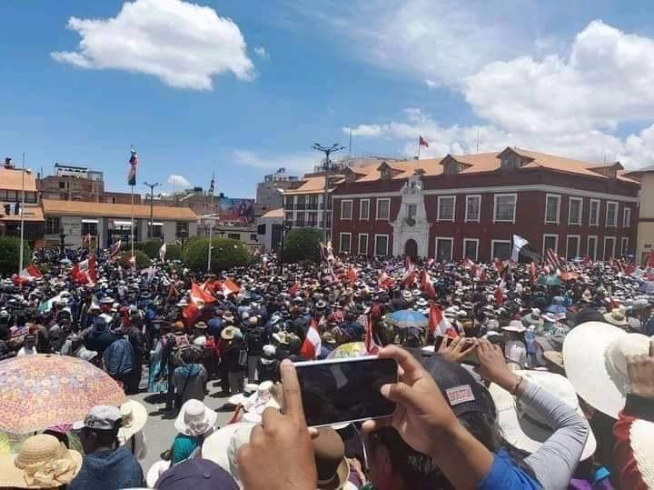 Poco a poco van trasladándose al centro de la ciudad llenando la plaza de armas, en el lugar donde esta ubicada la comisaría central los agentes policiales han colocado una barrera en la puerta con sacos de arena en previsión de algún enfrentamiento.